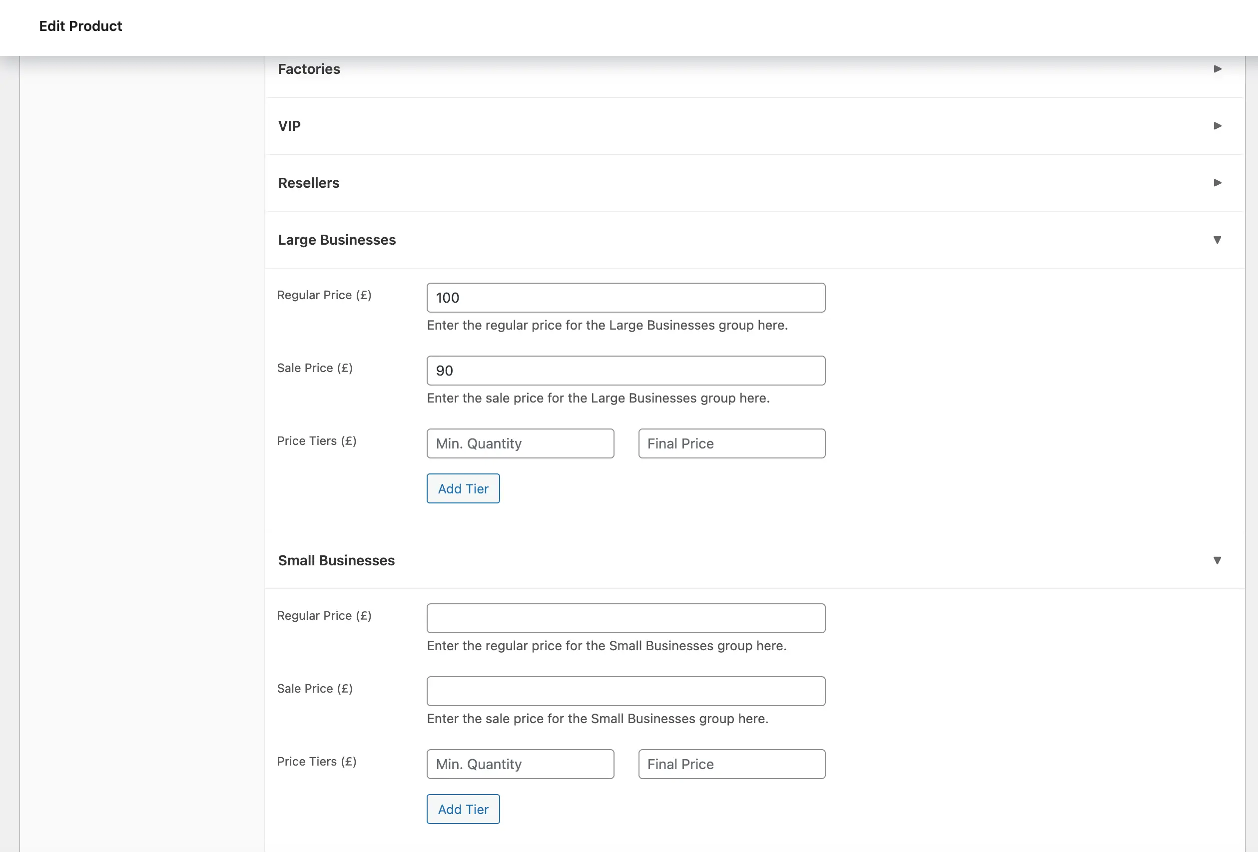 B2BKing addresses this through customer groups. You can create unlimited groups such as Retailers, Distributors, Premium Partners, or any classification that makes sense for your business. Each group can have its own unique pricing across your product catalog. A small retailer might pay list price while a major distributor sees prices 30% lower on every product.