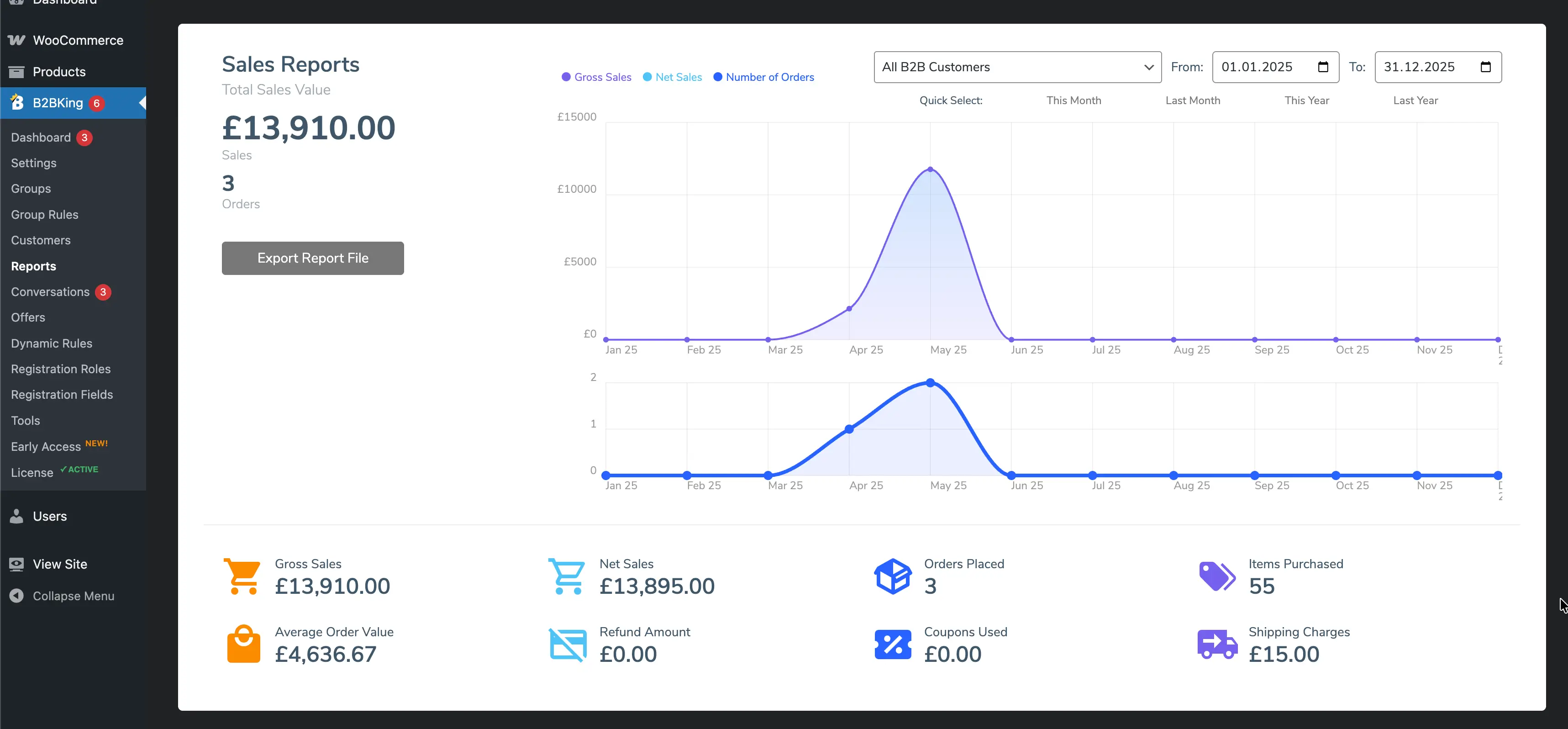 Understanding your B2B performance requires dedicated reporting. B2BKing includes a reports and analytics section where you can view sales data segmented by B2B vs. B2C, by individual customer groups, and by individual customers.