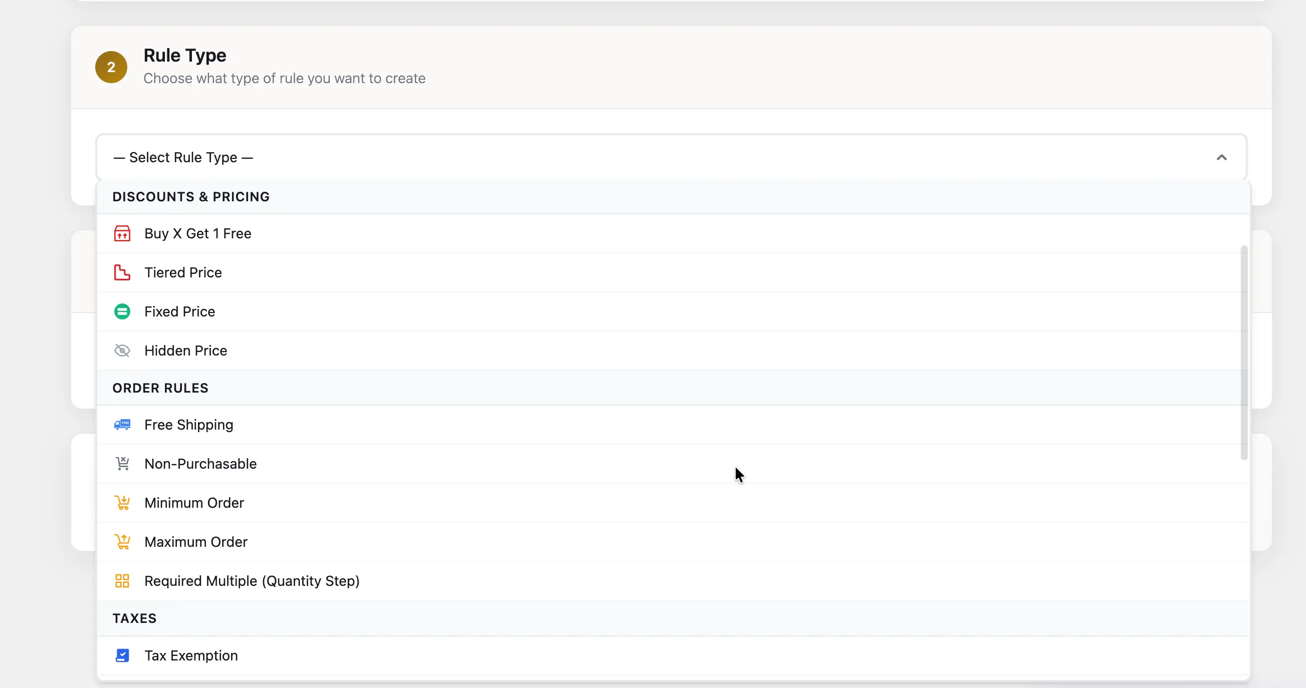 The available rule types include: percentage discounts, fixed-amount discounts, fixed prices, hidden prices (hide pricing for specific users or products), free shipping, minimum order quantities, maximum order quantities, required multiples (for box/carton quantities, e.g. must purchase in multiples of 12), tax exemptions, zero-tax on specific products, added taxes or fees, BOGO (buy X get one free), non-purchasable rules, tiered price rules, and payment method surcharges or discounts.