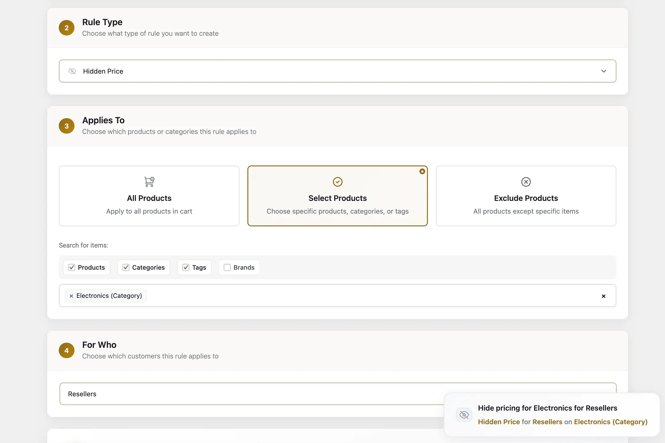 Each rule can target specific products, categories, individual users, customer groups, all B2B users, all B2C users, or all guests. And each rule can have conditions attached: minimum cart quantity, minimum cart value, minimum product quantity, or minimum category value.