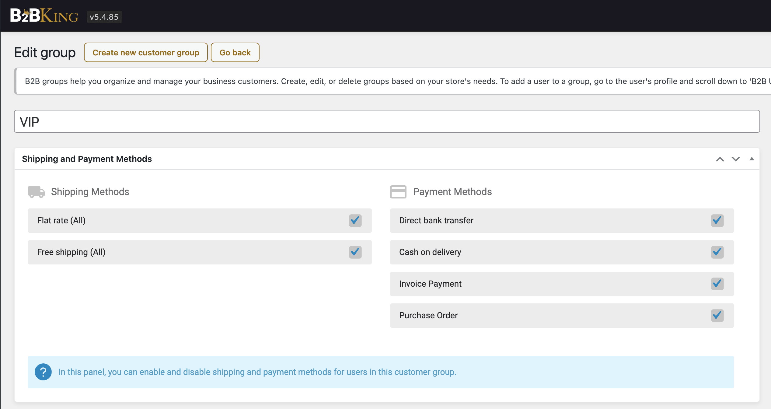B2BKing gives you full control over which payment and shipping methods are available to each customer group, and even to individual users. You can configure this directly in the group settings panel: for each group, simply check or uncheck the payment and shipping methods that should be available.