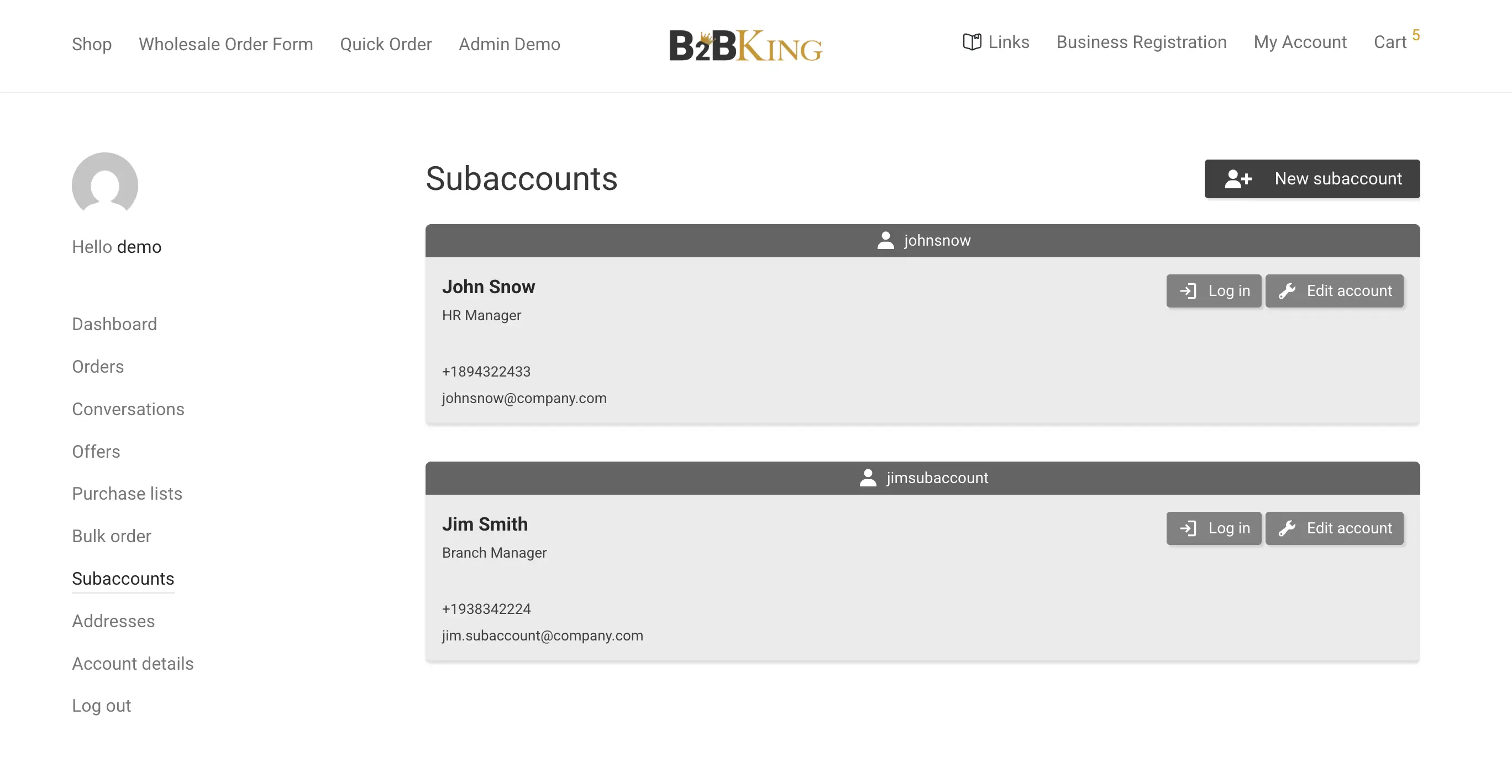 B2BKing supports this through subaccounts. The main account holder, typically a purchasing manager or owner, can create additional logins for employees or branch locations under the same company account. Each subaccount has its own credentials and can have its own shipping address, which is particularly useful for multi-location businesses where each branch needs orders shipped to its own dock.