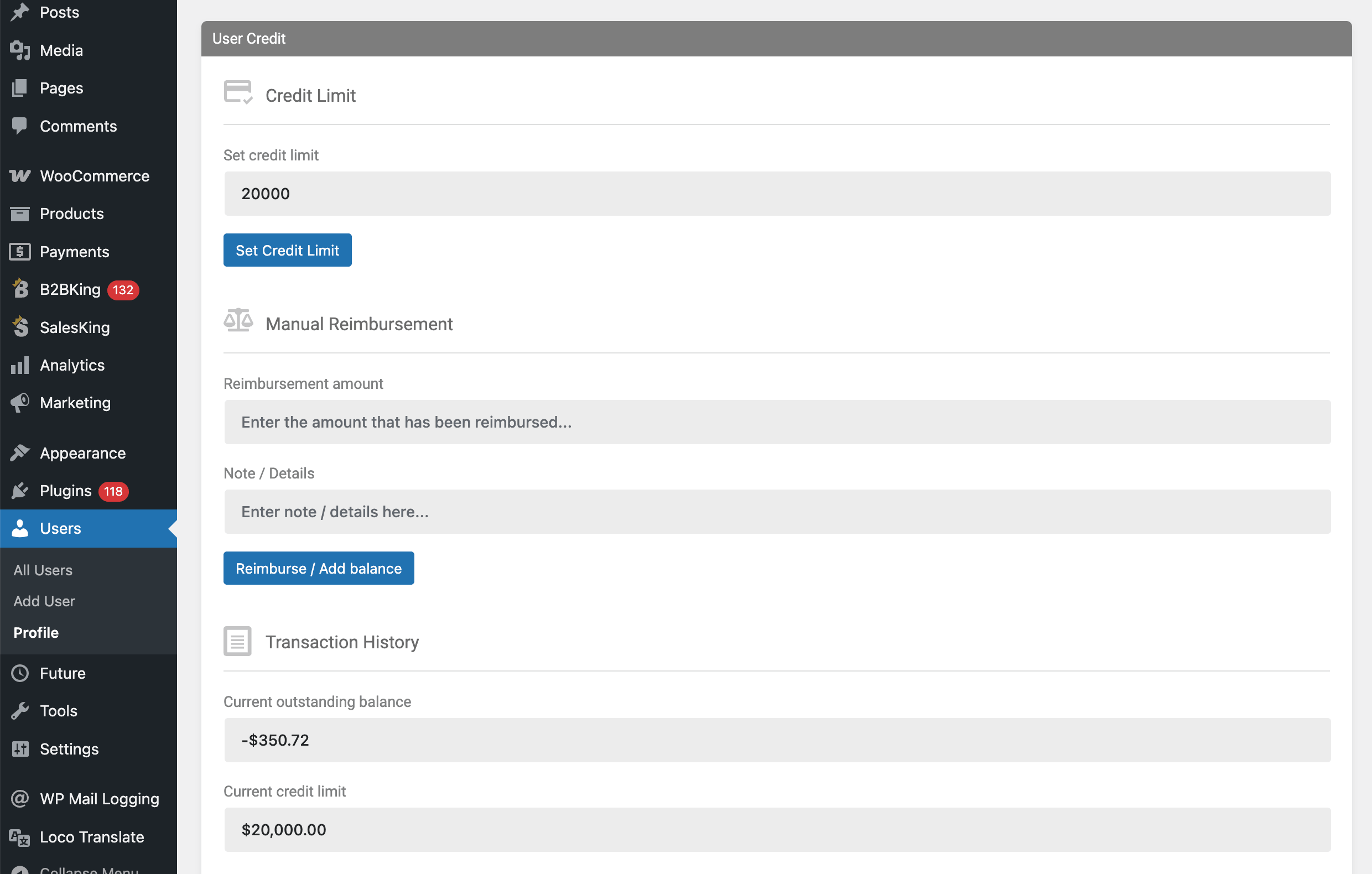 The company credit module allows wholesale buyers to purchase on credit and settle the balance later, in line with standard B2B trade terms. Each account can be assigned a credit limit, and orders draw against that limit until it is paid down.