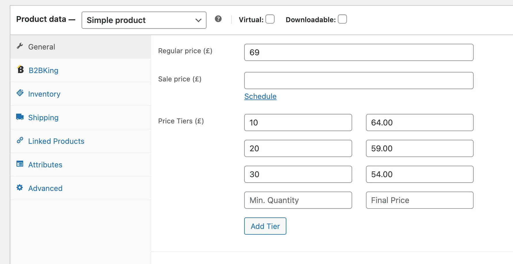 Tiered pricing is ideal for volume discounts and is the primary mechanism through which bulk pricing can be set and incentivised. B2BKing renders tiers as a frontend pricing table on the product page so the buyer can see at a glance what the next bracket looks like. Tiers can be set per product, per group, or globally, and they combine with the rest of the discount system rather than replacing it.