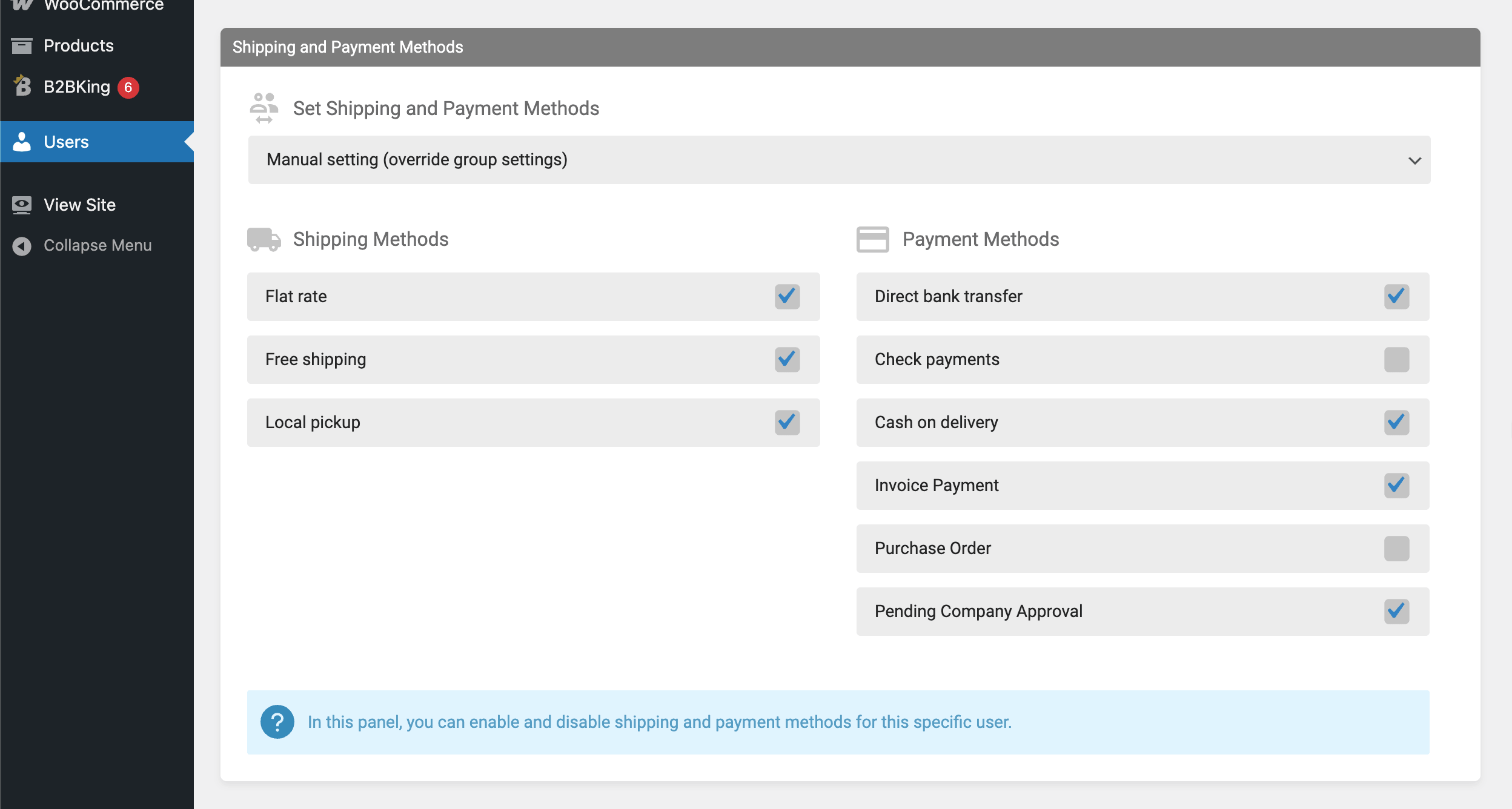 B2BKing lets you control which payment and shipping methods are visible per user or per user group. A new account, still on its first few orders, might be limited to credit card or PayPal where the seller has chargeback protection. An established account with a multi-year history might also see wire transfer, purchase order, or net-30 invoice payment.