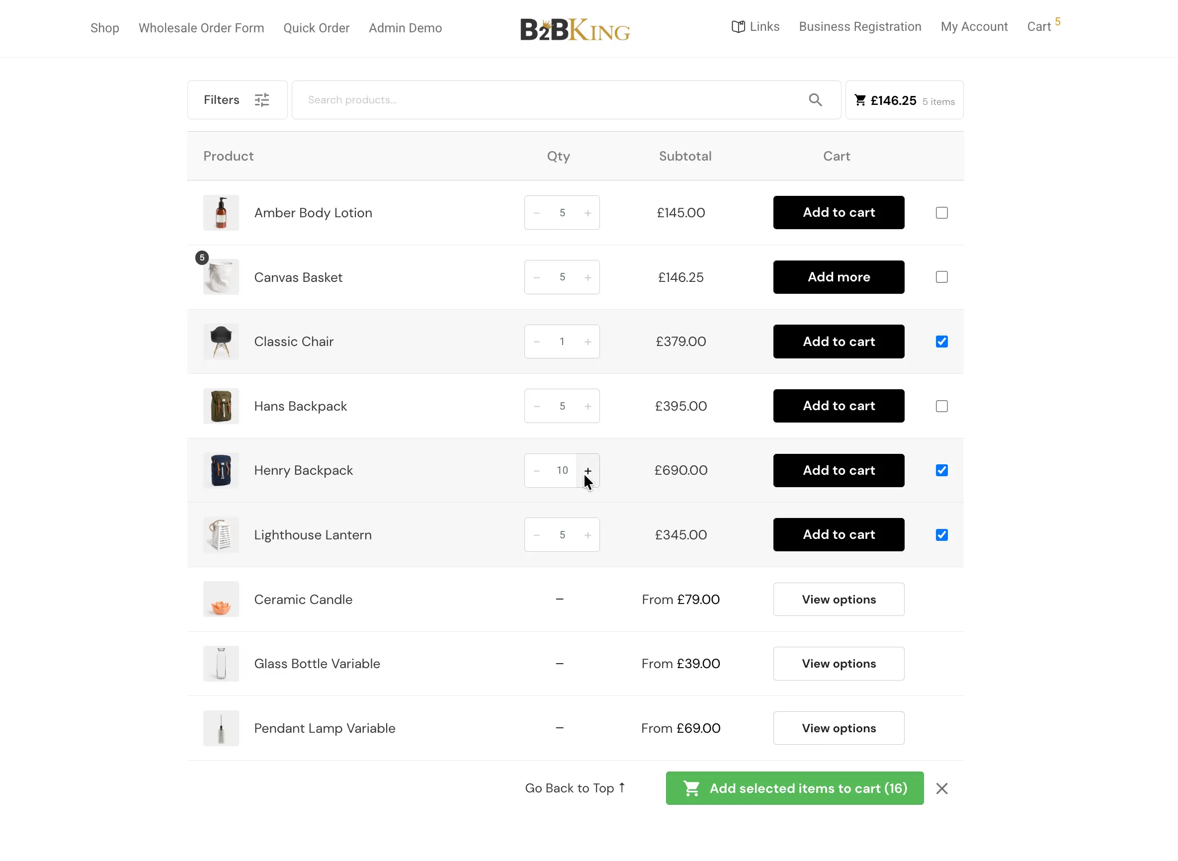 A retail buyer typically adds one or two items to the cart. A wholesale buyer might be filling a quarterly purchase order across fifty SKUs. Loading those products one at a time through the standard product page flow is slow and frustrating, so B2BKing adds several tools that compress the process.